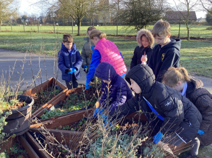The Eco Warriors and Mrs Durham have been busy this week refurbishing the flower beds in the playground in preparation for the planting of the new bulbs and flowers.