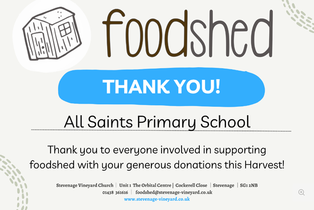 A huge THANK YOU to everyone who donated food items so generously. These have been taken to the Stevenage Foodshed, a referral-based foodbank in Stevenage run entirely by volunteers and which has given away 10,000 food parcels to families in need over the past year.