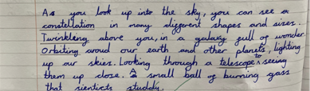 Just before Christmas, we had a visit from our School Effectiveness Adviser, Julie Winwood, with a focus on writing. As you will know, the whole school has started using ESSENTIALwriting and ESSENTIALspelling to support improvements in writing. Julie worked with us to evaluate how this work is going and we are delighted to share some of the details from her report. She found that, “Writing has a high profile across the school” and that, “Many opportunities are planned for pupils to revisit learning and therefore, embed their writing skills to their long-term memory.” She was impressed with the training that has been provided to all staff and pupil behaviour in class. She also commented on how “Christian values clearly shine through”. As part of the visit, we reflected on handwriting and presentation across the school.