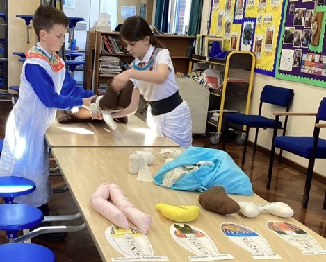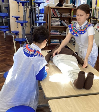 On Tuesday, Year 4 took part in an Ancient Egyptian workshop, led by Hertford Museum. The children stated that they really enjoyed learning about what Ancient Egyptians wore and why they wore these types of outfits. The children even got to try on typical clothes for Egyptians, look at replica jewellery and statues too! The workshop led Year 4 through the process of mummification before the children acted this process out with a doll. We learnt that this process only happened to rich people, and we would have been classed as poor. Year 4 look forward to learning more about Ancient Egyptians as our topic, after the Easter half term.